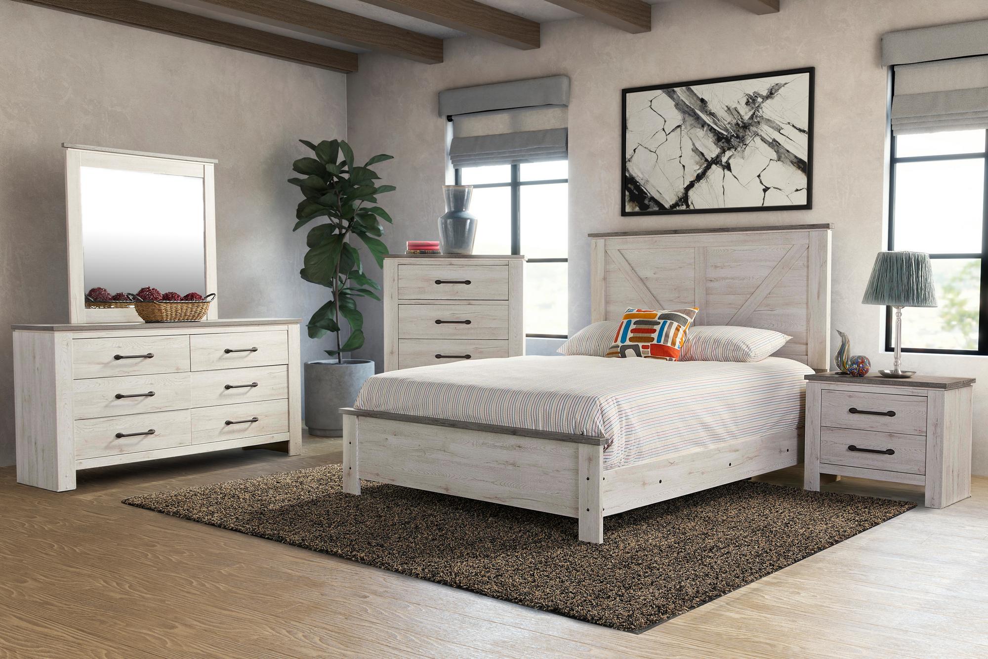 Link: Queen Adorna 2-Tone Bed w/Chest, Dresser, Mirror, Nightstand